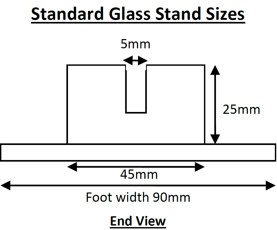As standard all Glass Stands are 25mm high and 45mm wide.
